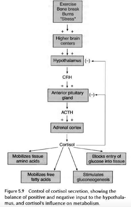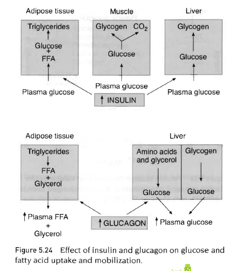 글루카곤은 간에 저장된 포도당 분해와 지방조직으로부터 유리지방산의 동원을 자극함. 나중에 코티졸과함께 글루카곤은 간에서 당합성을 자극함.