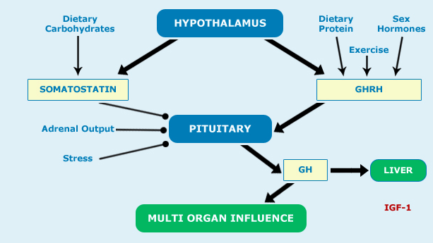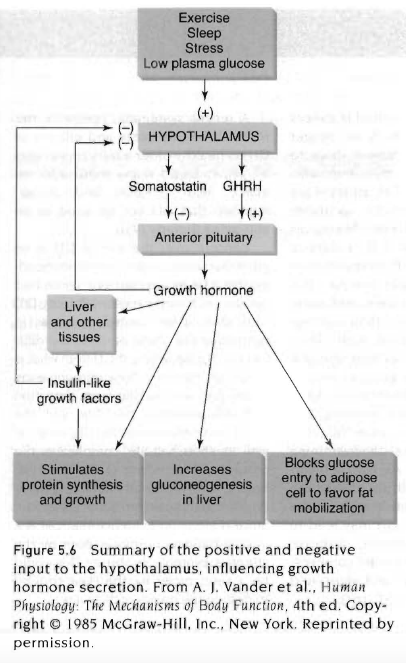 성장호르몬은 뇌하수체 전엽에서 분비되어 모든 조직의 성장에 큰 효과. 성장 자극호르몬이 뇌하수체 전엽에서 성장호르몬 분비를 자극함. 반면 시상하부 성장억제 호르몬(hypothalamic somatostatin)은 그것을 억제함. 혈액내 성장호르몬과 소마토메딘(성장호르몬 촉진인자) 수치는 성장호르몬의 지속분비에 대해 negative 피드백 효과를 발휘함.