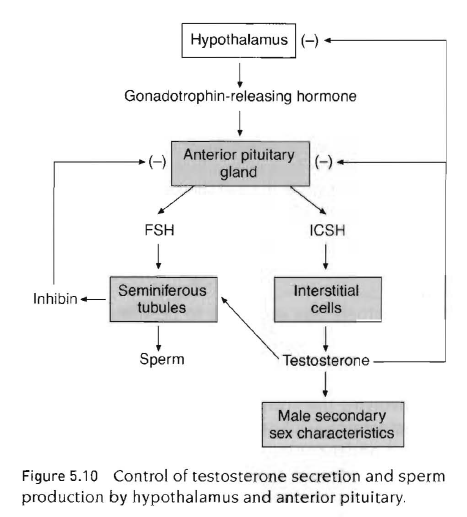 테스토스테론은 고환의 개재세포에서 분비되고, 뇌하수체 전엽에서 생성된 개재세포자극호르몬에 의해 조절됨. 반면 개재세포자극호르몬은 시상하부에서 분비된 분비호르몬에 의해 조절됨.