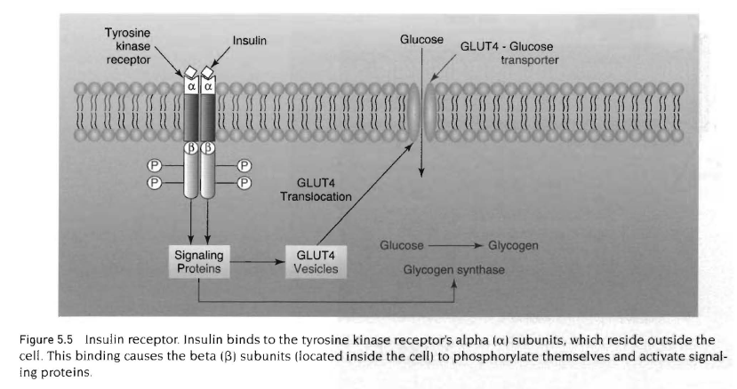 인슐린은 세포에 미치는 영향에 대해 2차 전령기전을 사용하지 않음. 인슐린은 세포밖에 존재하는 타이로신 전이효소 수용체 알파 소단위에 결합됨. 이 결합은 세포안에 있는 베타 소단위의 인산화를 일으킴. 타이로신 전이효소 수용기는 포도당 운반물질을 세포막으로 움직여 포도당이 세포안으로 들어가게 하고, 당원합성효소를 활성화시켜 포도당으로부터 당원을 만듬. 성장 호르몬 또한 타이로신 전이효소를 통해 작동하나 이 경우 성장호르몬의 세포외 고유수용기와 우선적으로 결합함. 이 결합으로 인해 세포질 타이로신 전이효소가 증가하고 성장 호르몬 수용기의 세포외에 있는 타이로신을 인산화시킴. 이러한 활성화는 세포내의 유전자 발현이나 대사작용의 변화를 유도함.