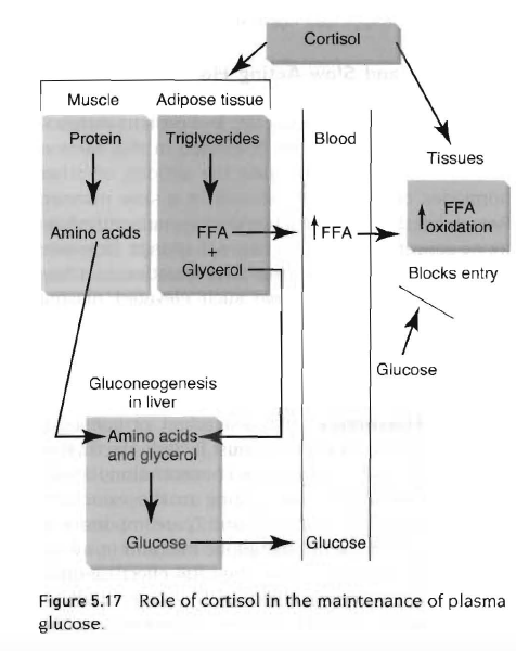 코티졸은 지방조직으로부터 유리지방산 동원을 자극, 간에서 포도당 합성을 위한 아미노산을 생산하기 위해 조직단백질을 동원, 세포의 포도당 비율 감소 3가지 역할을 함.