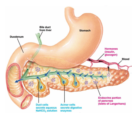 췌장은 내분비선과 외분비선을 가지고 있음. 외분비는 소화효소와 중탄산염을 포함. 랑게르한스 섬이라는 내분비선에 인슐린, 글루카곤, 성장억제호르몬이 있음.