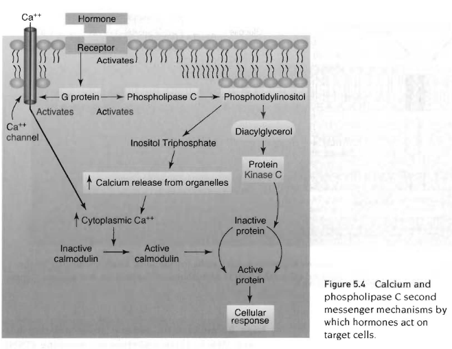 만일 G단백질이 Ca2+ 채널을 활성화시키면 Ca2+가 세포로 들어가 칼모듈린이라는 단백질과 결합하여 이를 활성화시킴. 활성화된 칼모듈린은 순환성 AMP와 같은 방법으로 세포활성화에 영향을 줌. 나중에 G단백질은 막 결합효소인 포스포리파아제를 활성화 시킴. 이때 세포막내 인지질인 포스포티딜이노시톨은 2개의 세포내 분자인 이노시톨 삼인산과 디아실글리세롤로 분해됨. 이노시톨 삼인산은 세포내 저장된Ca2+방출을 유발함. 또한 디아실글리세롤은 세포내 단백질을 활성화시키는 단백질 전이효소 C를 활성화 시킴. 순환성 AMP , Ca2+, 이노시톨 삼인산, 디아실글리세롤 등은 세포막에서 호르몬이 수용기와 결합한 후 일련의 과정에서 2차 전령으로 볼 수 있음.