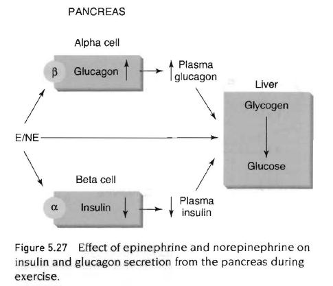 요약하면 다양한 강도와 시간의 운동에 대한 에피네프린, 노르에피네프린, 성장호르몬, 코티졸, 글루카곤, 인슐린의 호르몬 변화를 보여줌. 인슐린의 감소와 다른 모든 호르몬의 증가는 포도당 섭취를 억제하는 대신, 간으로부터 포도당 동원과 지방조직으로부터 유리지방산, 간에서의 당신생을 촉진함. 이러한 결합된 역할은 혈장 포도당 농도에 대한 항상성을 유지시켜서 중추신경계와 근육에 필요한 대사연료를 가질 수 있게 함.