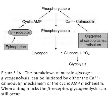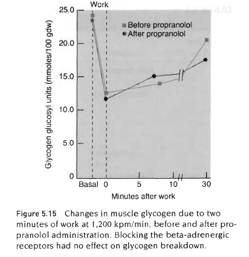 근육에서 당원분해가 운동중에 순환하는 에피네프린에 의해 조절된다는 가설을 검증하기 위해 피험자에게 세포막에서 베타1, 2 아드레날린성 수용기를 차단하는 약물인 프로프라놀롤을 투여함. 변화없음.