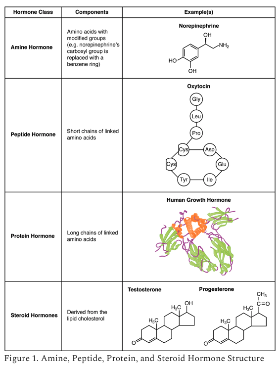 호르몬은 화학적 구성에 따라 "아미노산 유도체, 펩티드/단백질, 스테로이드"로 구분됨. 그것의 화학적 구조는 호르몬이 혈액으로 운반되는 방법과 조직에 영향을 미치는 방식에 영향을 줌. 예를들어 스테로이드 호르몬의 지질구조는 혈장에서 해리되기 위해 혈장단백질과 결합하여 운반될 필요가 있기 때문에그와 같은 지질구조는 효과를 발휘하기 위해 막을 통과하여 확산될 수 있도록 허용함.