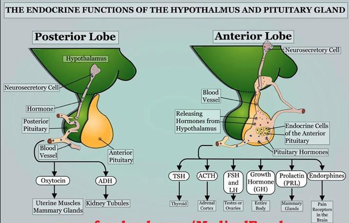 시상하부의 뇌하수체 전엽과 후엽에서 분비되는 호르몬들 그림참조
