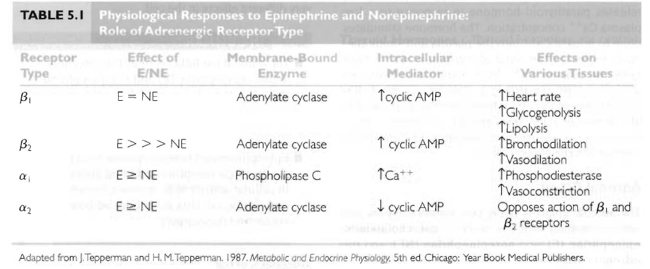 에피네프린과 노르에피네프린은 목표조직에서 아드레날린성 수용기와 결합함. 이 수용기는 알파와 베타로 나뉨. 에피네프린과 노르에피네프린은 2차 전령기전에 의해 효과를 나타냄. 목표조직에서 생성된 반응은 크기와 방향(흥분성 또는 억제성) 면에서 모두 수용기의 형태와 에피네프린인지 노르에피네프린인지의 여부에 따르 다르게 나타남. 이것은 수용기가 세포의 호르몬 반응을 결정하는데 얼마나 중요한지 보여주는 한 예임.