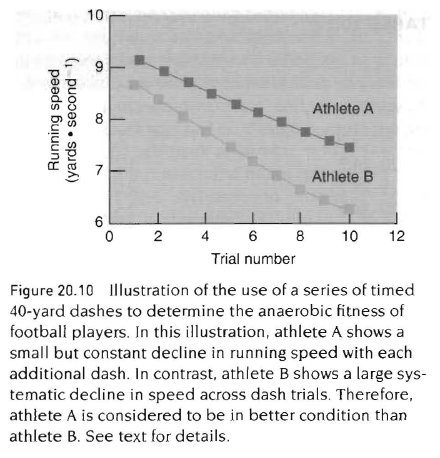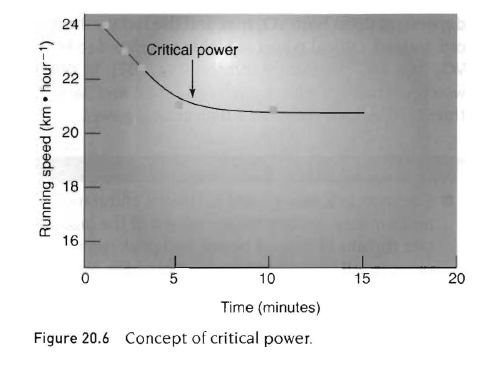 위 그림은 달리기 수행능력에 대한 임계파워 개념을 나타냄. 임계파워는 달리기 속도/시간 곡선이 고원화에 도달하는 시점의 달리기 속도(파워산출)로 정의됨. 이론적으로 임계파워는 무제한 으로 유지될 수 잇는 파워산출로 고려됨. 그러나 실제로 이러한 경우는 없음. 임계파워에서 운동을 할때 대부분의 운동선수들은 30-60분내에 피로해짐.