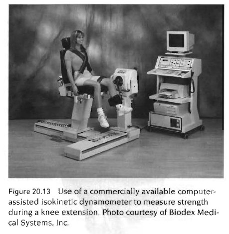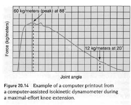 등척성 근력측정은 여러가지 관절각도에서 수행됨. 각각의 관절각도에서 등척성 검사는 보통 2회-3회의최대수축(5초동안)으로 구성되며, 시도 횟수 중 최댓값이 근력측정치가 됨.