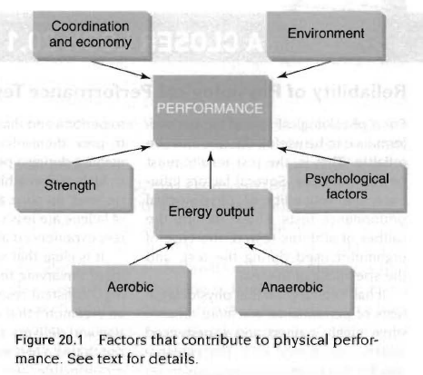 일반적으로 신체적 운동수행능력은 최대에너지 산출(최대산소전달, 유산소와 무산소 과정등), 근력, 운동의 협응/효율 그리고 심리적 요인들에 대한 개인적 능력에 의해 결정됨.