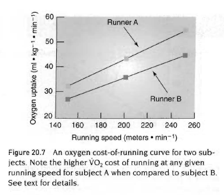 비효율적인 선수는 일정한 속도에서 효율적인 선수에 비해 달리는 데 매우 많은 양의 에너지를 소비함. 다른 모든 변인이 같다는 조건하에서 시합을 하게 되면 효율성이 높은 운동선수가 낮은 운동선수를 이길것임. 그러므로 운동효율의 측정은 운동선수의 잠재적인 운동수행능력을 평가하는 실험실 검사로 적절하다고 여겨짐.