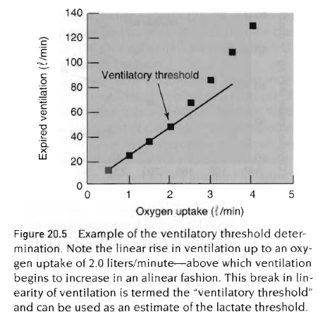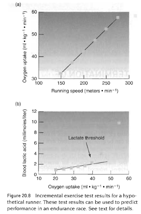 여러 연구를 통해 젖산 역치 또는 환기 역치 그리고 1만미터 달리기를 유지시킬 수 있는 최대속도간에는밀접한 관계가 있음을 증명함. 실례로 잘 훈련된 운동선수들은 그들의 젖산역치 대략 5m.min-1 페이스로 1만미터를 달림.