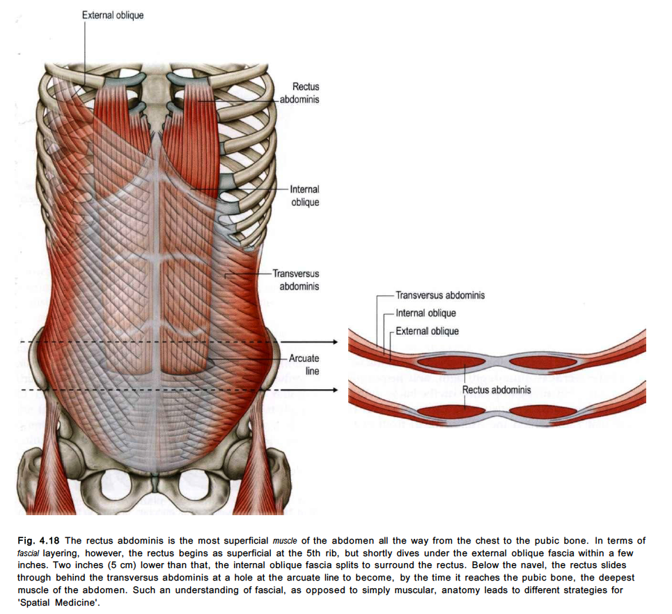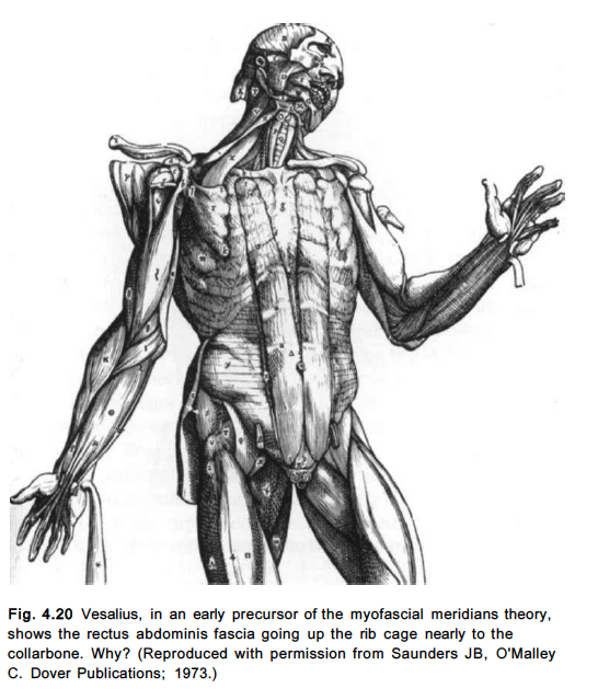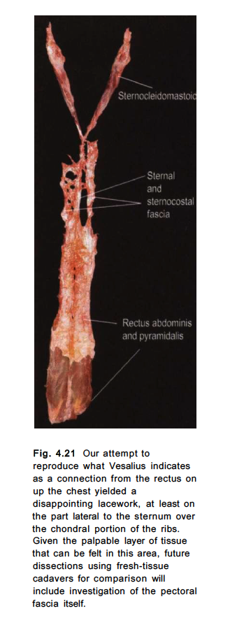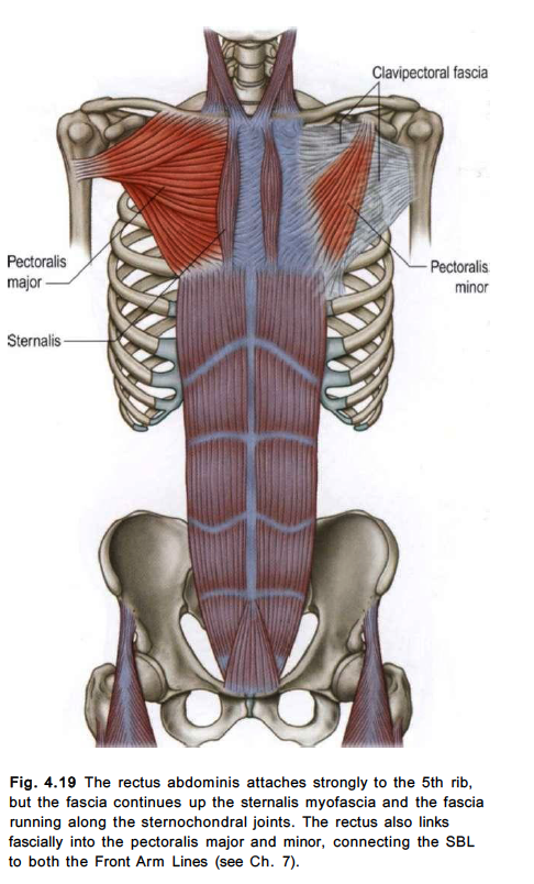 복직근은 5번째 늑골에 강하게 부착되어 있으나, 그 근막은 흉골의 근육근막을 따라 위로 연결되어 있으며, 흉연골연접부를 따라 주행하고 있다. 복직근은 근막적으로 대, 소 흉근에 연결되어 있어 표면후방선을 양쪽 상지선에 연결하고 있다.