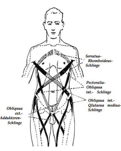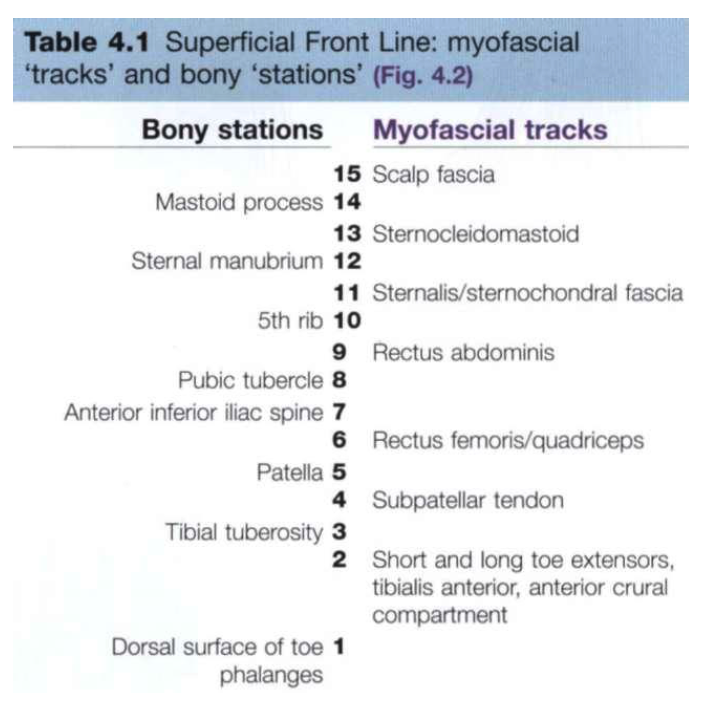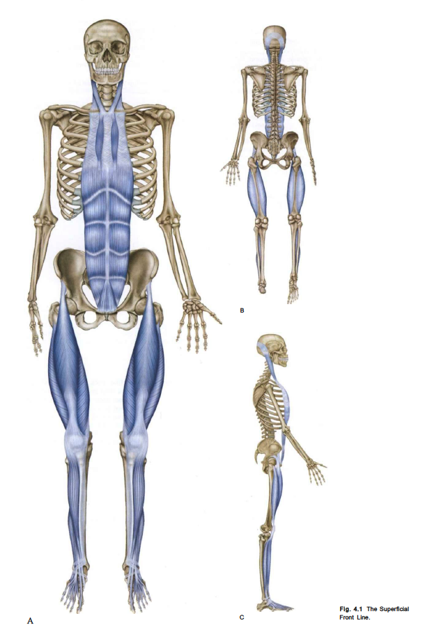 표면전방선은 발끝에서 두개골 양측면까지 신체의 앞 표면전체를 두개의 부분으로 연결. 선자세처럼 고관절을 신전시킬 경우 통합된 근막은 하나의 연속적인 근막선으로 기능