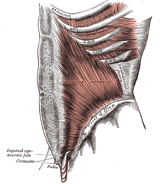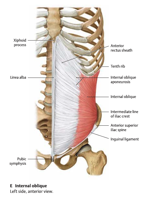 내복사근은 서혜인대, 장골릉, 흉요건막에서 기시하여 백선, 늑골 10~12번에 종지함.