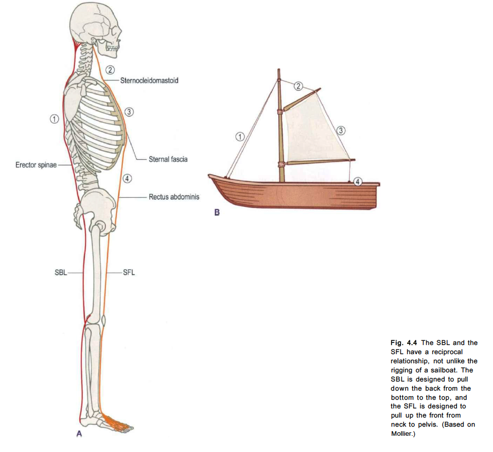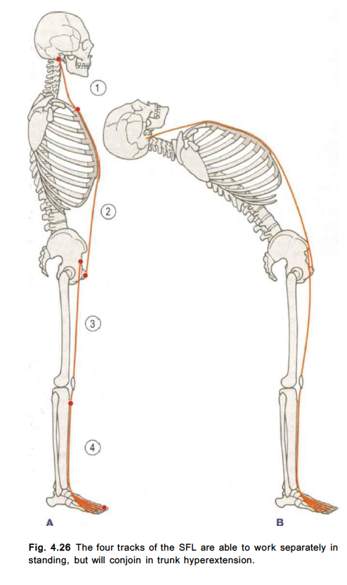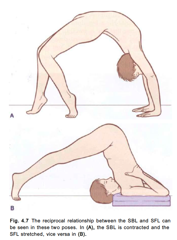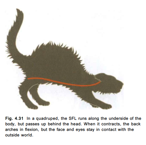 dorsiflexion of the foot (Fig. 4.6). The SFL performs a complex set of actions at the neck level, which comes up for discussion below. The need to create sudden and strong flexion movements at the various joints requires that the muscular portion of the SFL contain a higher proportion of fast-twitch muscle fibers. The interplay between the predominantly endurance-oriented SBL and the quickly reactive SFL can be seen in the need for contraction in one line when the other is stretched (Fig. 4.7).