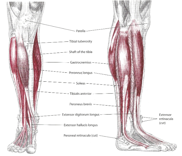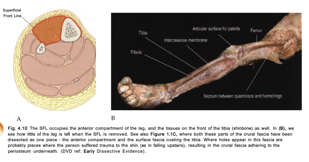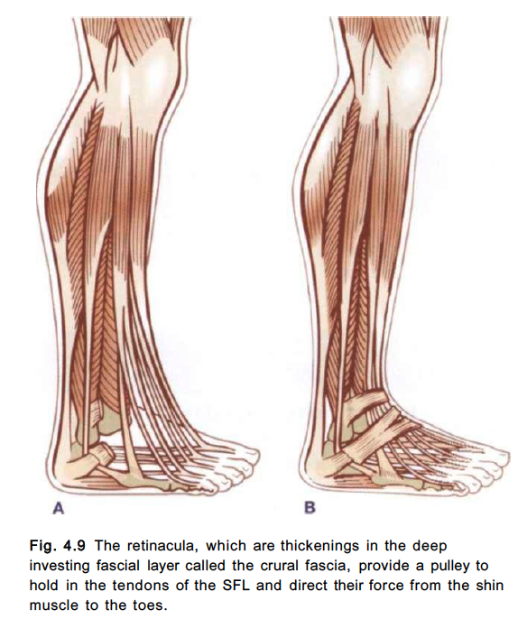The SFL begins on the tops of the toes. By the everything-connects-to-everything-else' fascial principle, the SFL technically joins with the SBL through the periostea around the tip of the toe phalanges, but there is no discernible 'play' across this connection. Functionally these two Anatomy Trains lines oppose each other, the SBL being responsible for flexing the toes, and the SFL taking on the job of extending them, and so on up the body. More practically, in postural terms, the dorsiflexors act to restrain the tibia-fibula complex from moving too far back, and the plantarflexors prevent it from leaning too far forward.