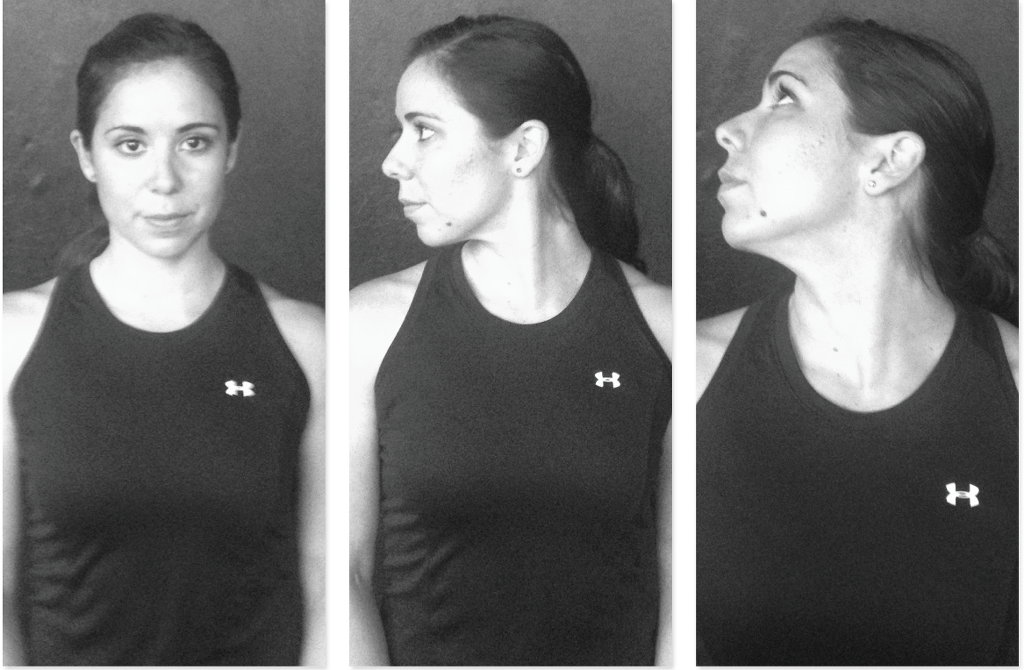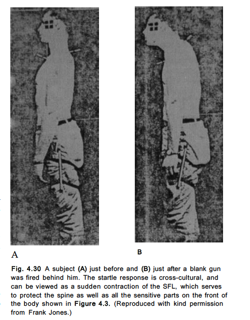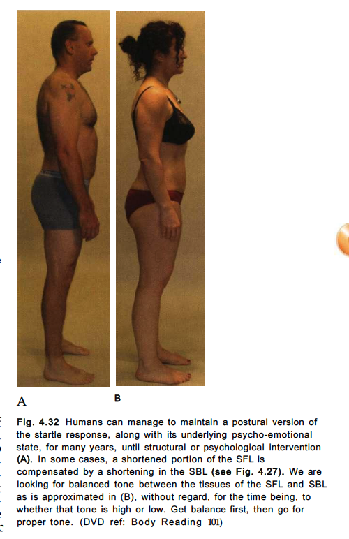 그런데 목에서는 신체의 이상이 굴곡이 아니라 신전으로 나타난다는 것이다. 아래 그림과 같이 놀람반응은 표면전방선의 단축을 보여주고 있다. 상부경추의 과신전 형태를 보이면서..