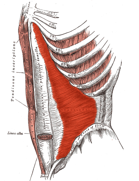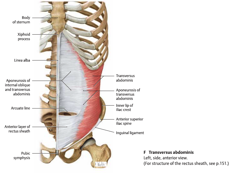 복횡근은 장골릉, 서혜인대, 흉요근막, 늑연골 7~12번에서 기시하여 흉골검상돌기, 백선, pubic crest에 종지함.
