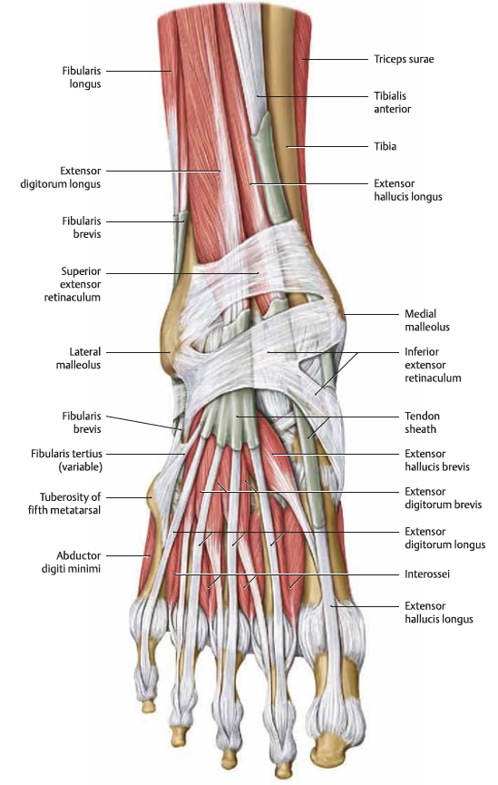 발을타고 올라감에 따라 표면전방선은 두개의 건을 더 포함함. 5번째 중족골에서 기시하는 제3 비골근(peroneus tertius)의 건이고, 내측에 있는 것은 발의 1번째 중족골에서 기시하는 전경골글의 건임. 따라서 표면전방선은 발등의 짧은 신근과 긴 건 모두를 포함함.