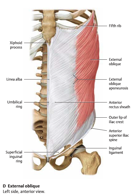 늑골 5~12번에서 기시하여 iliac crest, asis, inguinal ligament, pubic tubercle, linea alba에 종지함.