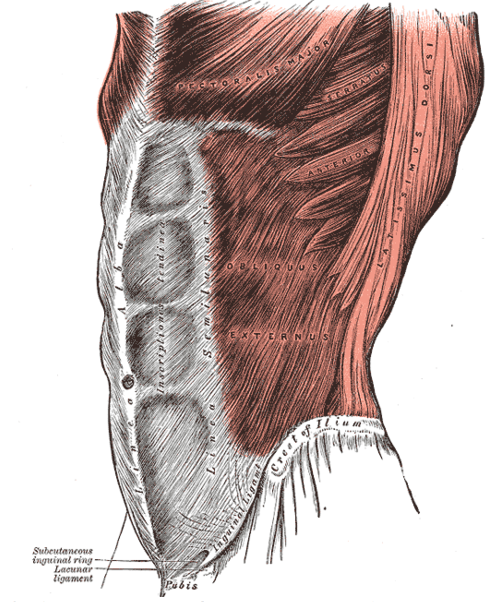 치골위에서 시작하여 복직근과 복사근, 복횡근을 둘러싸고 있는 근막층인 복부근막을 타고 위로 올라감.