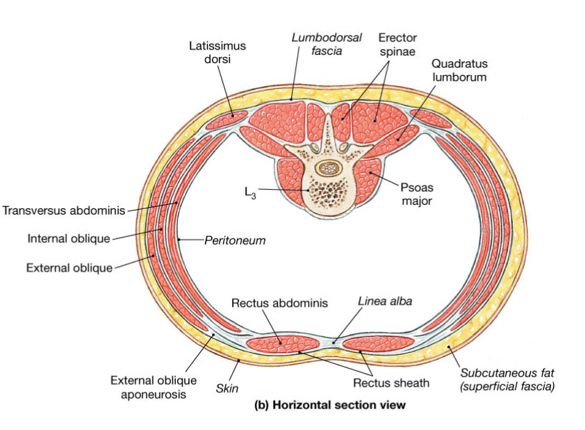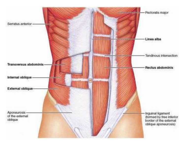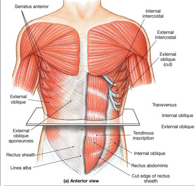 abdominal aponeurosis, linea alba - 외복사근, 전거근 - 견갑골 medial border - 능형근 - 견갑골 medial border - 극하근, 소원근 - 견봉 - 상완삼두근