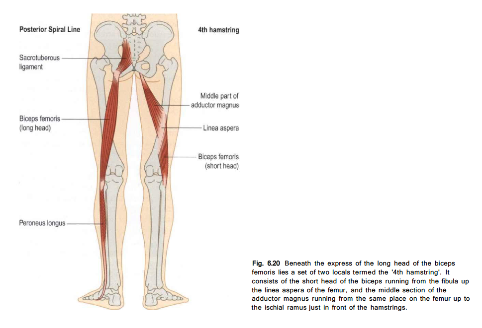 대퇴이두근 단두와 대내전근은 linea aspera(대퇴골 조선)을 기점으로 근막으로 연결된 짝힘을 이룸.