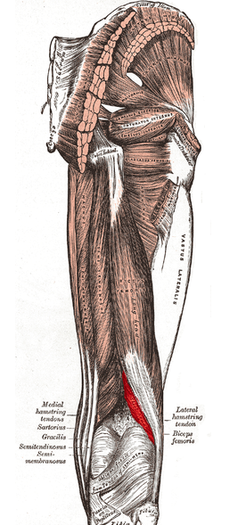 - the other, the short head, arises from the lateral lip of the linea aspera, between the adductor magnus and vastus lateralis, extending up almost as high as the insertion of the gluteus maximus; from the lateral prolongation of the linea aspera to within 5 cm. of the lateral condyle; and from the lateral intermuscular septum
