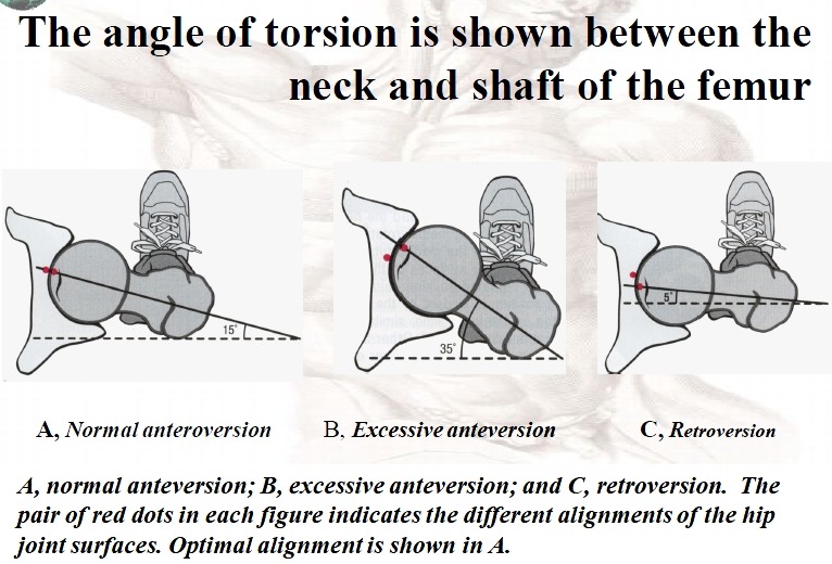 If there is excessive anteversion in the hip joint in which it rotates beyond 14 degrees to the anterior side, the person must assume an internally rotated posture or gait to keep the head in. Other accompanying lower extremity adjustments to the excessive anteversion include an increase in the Q –angle, patellar problems, increase in leg lengths, more pronation at