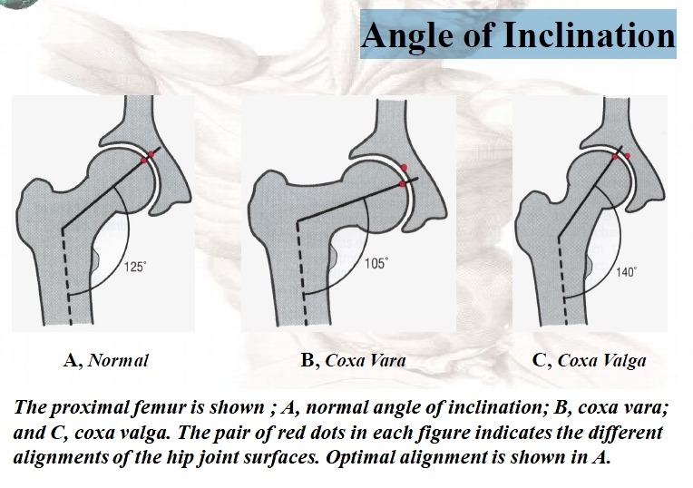 The angle is larger at birth by almost 20-25 degrees and it lowers as the person matures and assumes weight-bearing positions. It is also believed that the angle continues to lower into later adult years by approximately 5 degrees. The range of the angle of inclination is usually within 90 – 135 degrees. The angle of inclination is important as it determines the effectives of the hip abductors, the length of the limb, and the forces imposed on the hip joint (Hamill, 1995 p208)