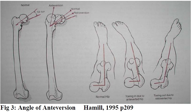 The angle of the femoral neck in the frontal plane is termed the angle of anteversion. The femoral neck is twisted forward or anteriorly in relation to the frontal plane of the femoral condyles. Normally the femoral neck is rotated anteriorly 12 to 14 degrees with respect to the femur. If this angle increases, a toe-in position is created in the extremity. If the angle of anteversion is reversed so the femoral neck moves posteriorly, it is termed retoversion. Retroversion causes a toeing-out of the extremity (Hamill, 1995 p209, Tachdijan, 1972 p1442).