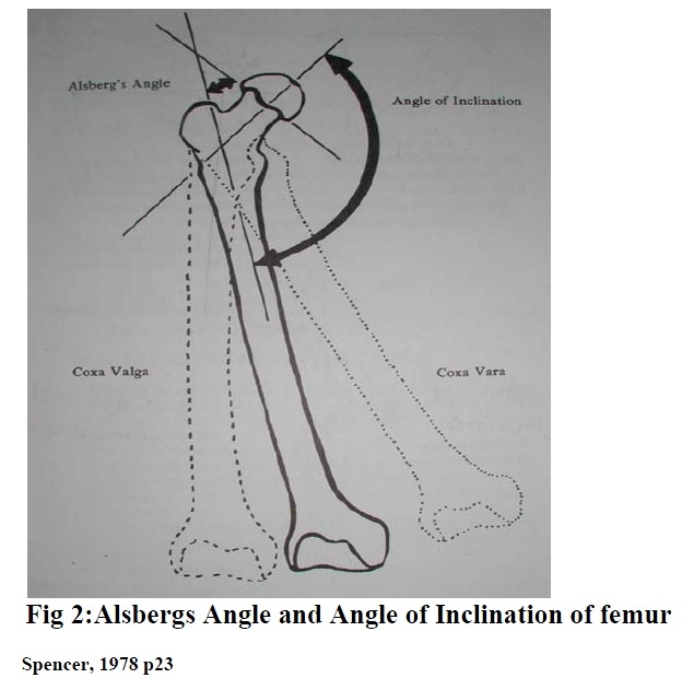 (Spencer,1978 p21), defines coxa valga as an increase in the angle of inclination (Alsberg’s Angle) such that the distal end of the femur is directed away from the midline and the knees are further apart. It is a frontal plane deformity. The Alsberg’s angle is the angle formed by a line through the base of the epiphyseal plane with the axis of the shaft of