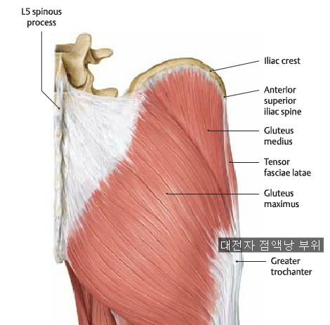 - 대둔근과 대전근 사이에서 충격을 흡수, 대둔근-장경인대의 움직임 부드럽게 함,