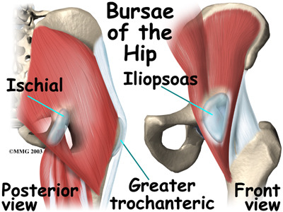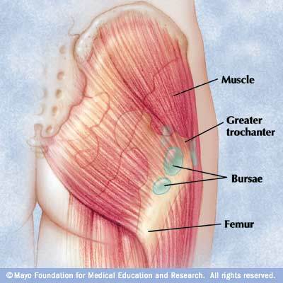 - 대전자 점액에 염증이 발생하면 고관절, 대퇴, 무릎부위에 통증이 발생
