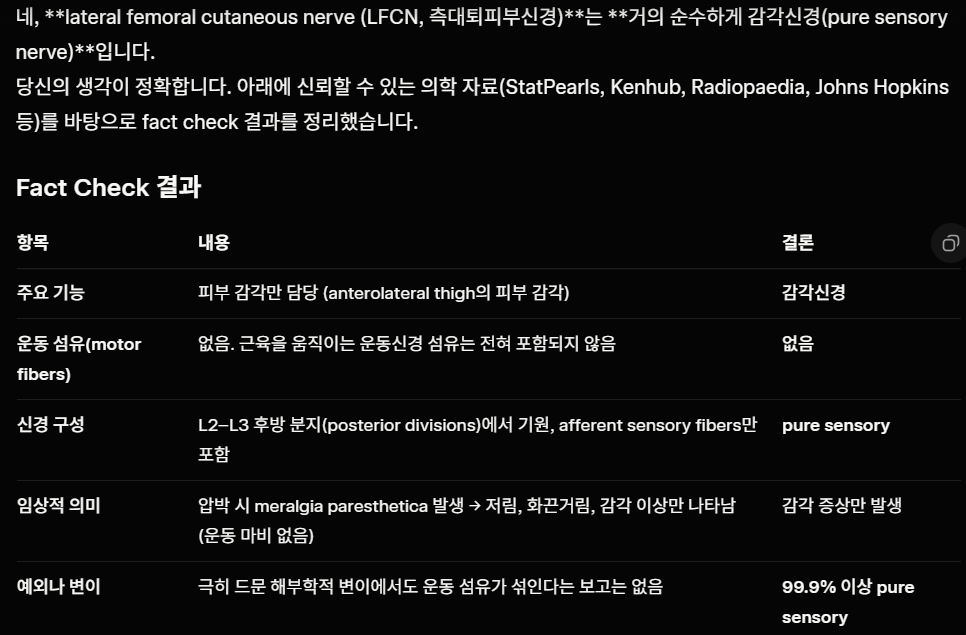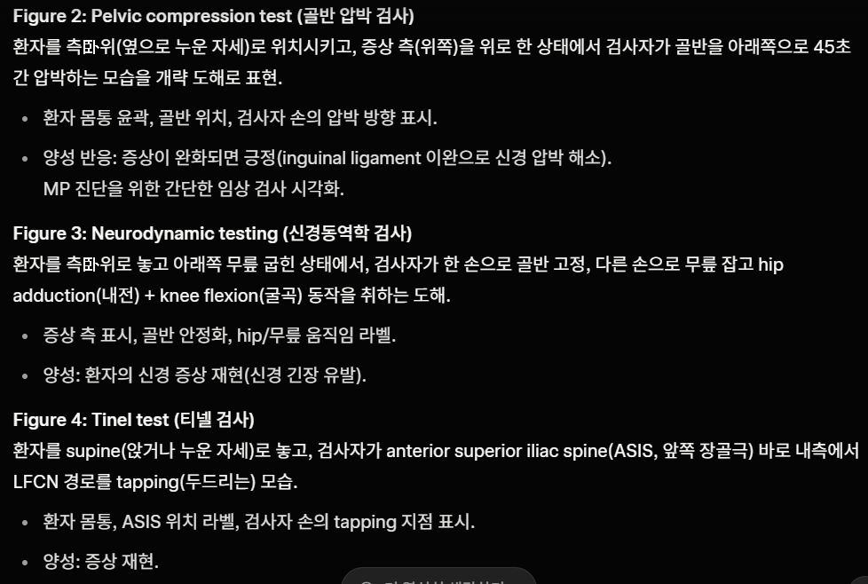 - 주요 증상: 대퇴부 바깥쪽의 타는 듯한 통증, 저림, 촉각 과민. 앉거나 서면 악화.