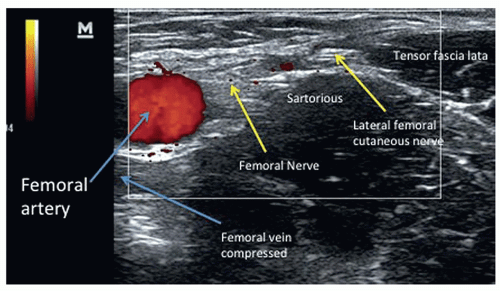 When conservative management fails, patients commonly transition to treatment with regional nerve blocks. Multimodal approaches combining corticosteroid injections of the LFCN with conservative pharmacologic treatments have been reported to have success rates between 85-91%.52,56 Ultrasound (US) technology is useful to correctly localize the LFCN and accurately guide the injection.57 This is important because blind injection can have a failure rate of up to 60% due to the anatomic variability of the LFCN.58
