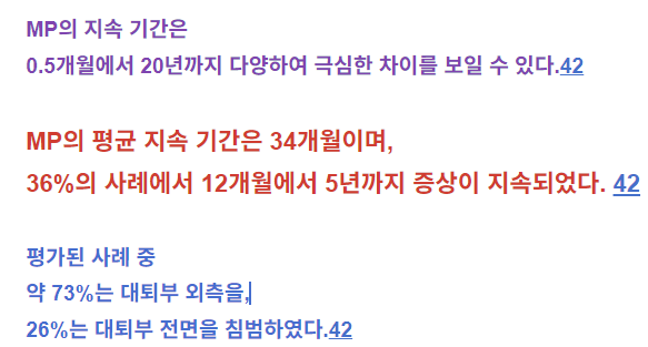 본 리뷰는 MP의 병태생리, 증상 양상 및 현재 치료 옵션에 관한 최신 의학 문헌을 종합한다.