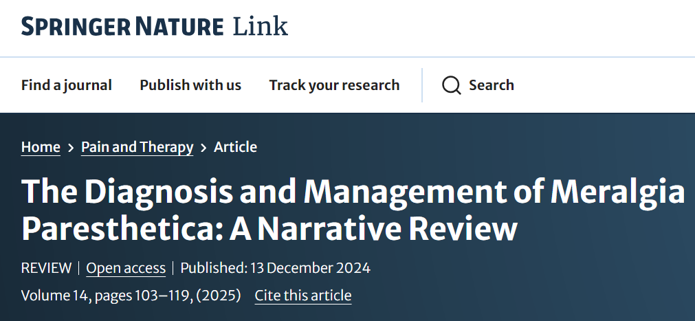 - MERALGIA PARESTHETICA: A REVIEW OF THE LITERATURE. Cheatham S.W., Kolber M.J., Salamh P.A. 2013Int J Sports Phys Ther. 8:883. [PMC free article] [PubMed] [Google Scholar]
