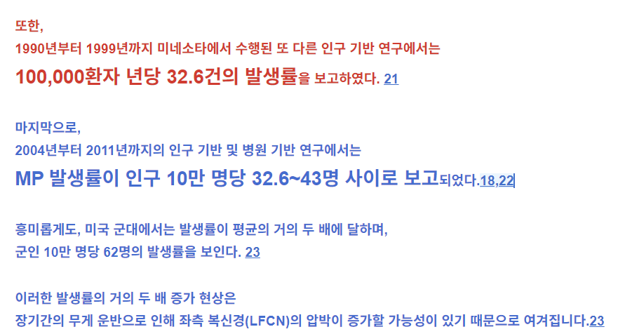 MP 발생률이 인구 10만 명당 32.6~43명 사이로 보고되었다.18,22