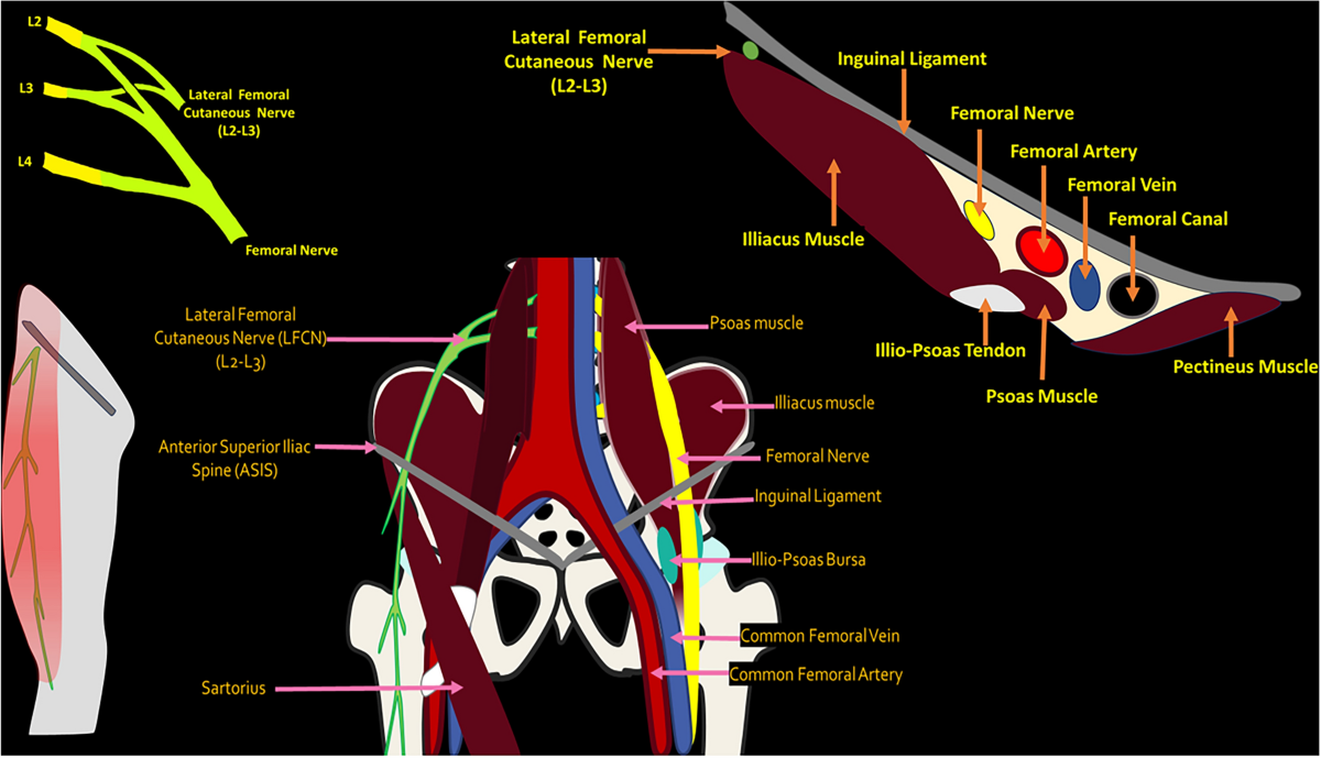 이후 LFCN은 전상장골극(ASIS)의 내측을 가로지르며,