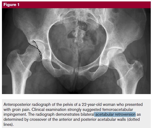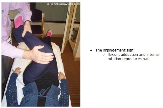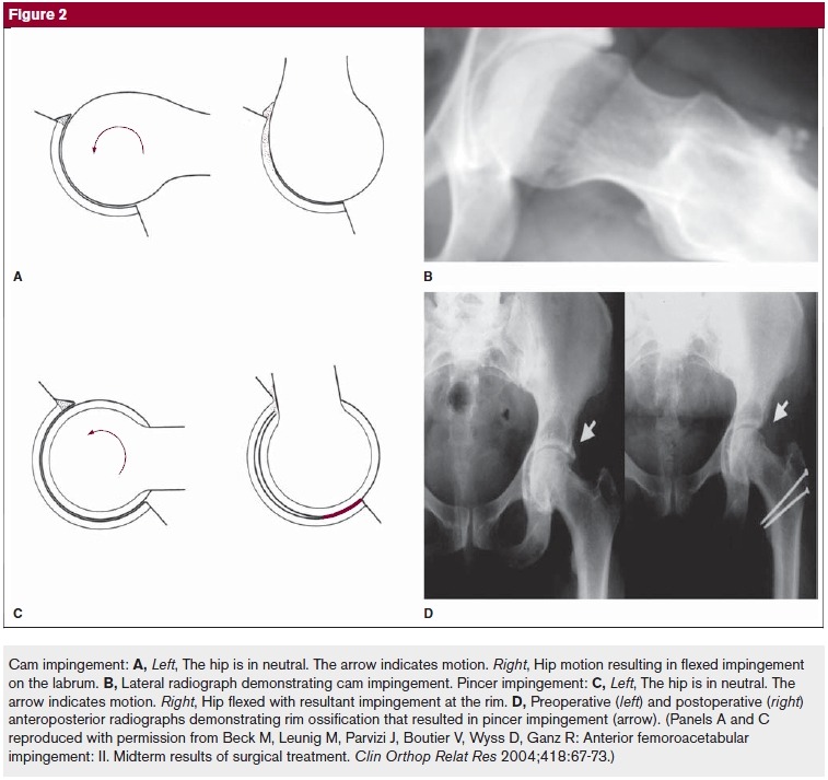 - 특히 젊고 활동적인 사람들에게 생기는 이른 고관절 관절염의 원인. acetabulum과 femur의 prominence 사이의 병리적 접촉이 원인. 전형적으로 flexion, 내회전에 생긴다.