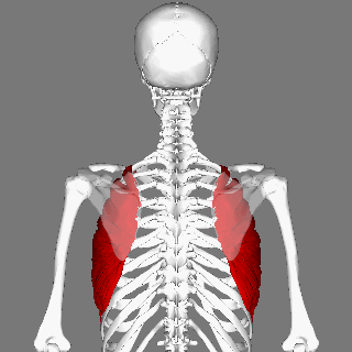 The muscle is inserted along the medial border of the scapula between the superior and inferior angles along with being inserted along the thoracic vertebrae. The muscle is divided into three named parts depending on their points of insertions:[1]