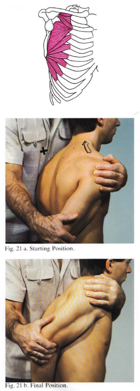 All three parts described above pull the scapula forward around the thorax, which is essential for anteversion of the arm. As such, the muscle is an antagonist to the rhomboids. However, when the inferior and superior parts act together, they keep the scapula pressed against the thorax together with the rhomboids and therefore these parts also act as synergists to the rhomboids. The inferior part can pull the lower end of the scapula laterally and forward and thus rotates the scapula to make elevation of the arm possible. Additionally, all three parts can lift the ribs when the shoulder girdle is fixed, and thus assist in respiration. [1]