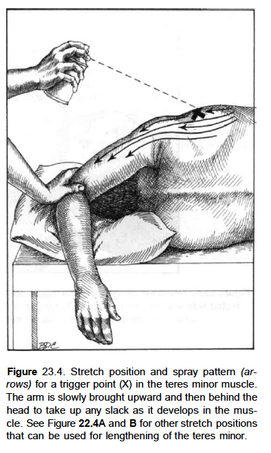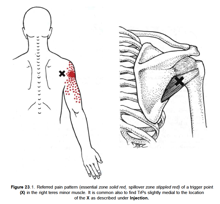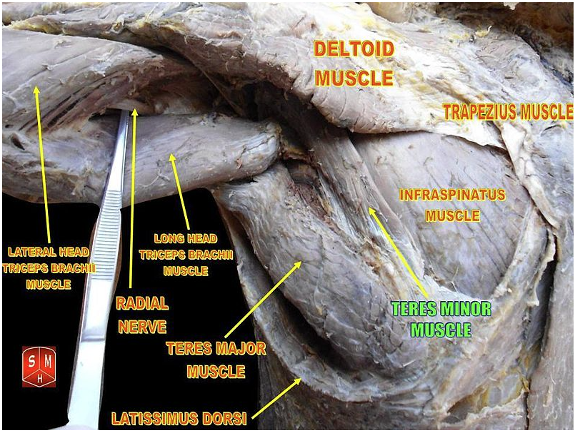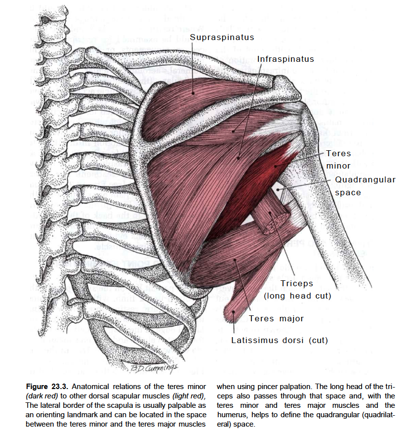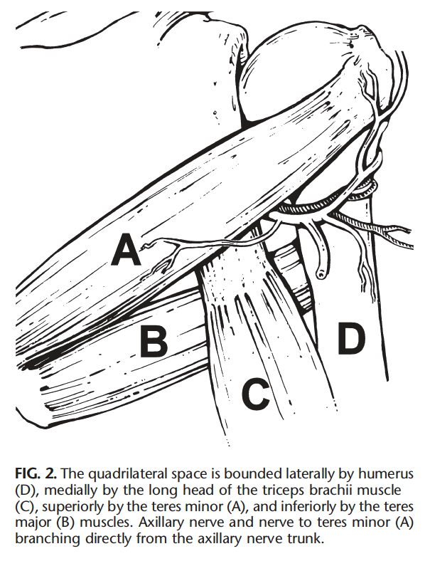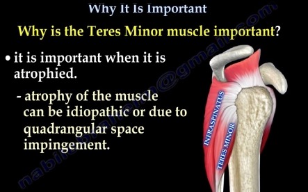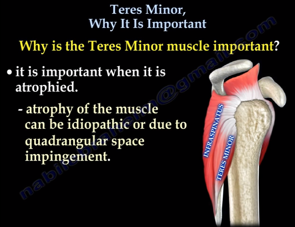 Atrophy of the teres minor muscle is often a consequence of a rotator cuff tear. But also uncommon isolated teres minor atrophies have been found. A so-called quadrilateral / quadrangular space syndrome causes excessive and or chronically compression of the structures which pass through this anatomical tunnel. The axillary nerve and the PHCA posterior humeral circumflex artery pass posteriorly through the space. The concerned patients note shoulder pain and paresthesia down the arm first and foremost in abduction, extension, external rotation and overhead activity. Selective atrophy of the musculus teres minor has been seen and pulled together directly with compression of the corresponding axillary nerve branch or PHCA. Fibrous bands, inferior paralabral cysts, lipoma or dilated veins can occupy the quadrilateral space pathologically. Similar symptoms are common with anterior shoulder dislocation, humeral neck fracture, brachial plexus injury and thoracic outlet and inlet syndrome. It is important to include those pathologies for a complete as possible differential diagnosis.