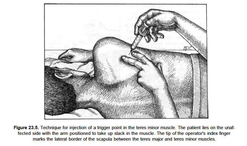 First to identify via ultrasonography is the characteristic shape of the infraspinatus muscle tendon unit. On the longitudinal view it reveals itself due to the central tendon and triangular shape. Subsequently the transducer has to be slided inferiorly, maintaining the same orientation in order to reach the teres minor muscle tendon unit. Following the unit leads to the broad insertion on the humerus. Rotating the transducer 90° allows the transversal view, on which the musculus teres minor insertion has a characteristic elongated shape.[3]