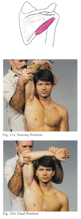 Its fibers run obliquely upward and laterally; the upper ones end in a tendon which is inserted into the lowest of the three impressions on the greater tubercle of the humerus; the lowest fibers are inserted directly into the humerus immediately below this impression.