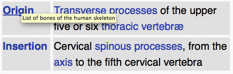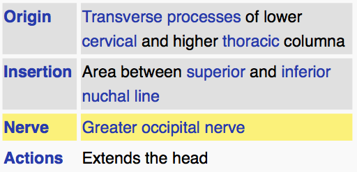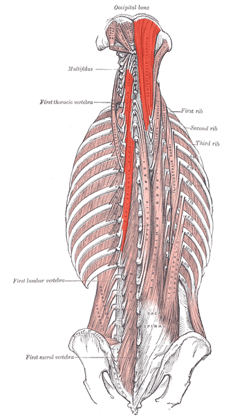 It arises by a series of tendons from the tips of the transverse processes of the upper six or seven thoracic and the seventh cervical vertebrae, and from the articular processes of the three cervical vertebrae above this (C4-C6). The tendons, uniting, form a broad muscle, which passes upward, and is inserted between the superior and inferior nuchal lines of the occipital bone.