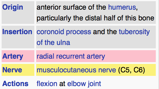 The brachialis (brachialis anticus) is a muscle in the upper arm that flexes the elbow joint. It lies deeper than the biceps brachii, and is a synergist that assists thebiceps brachii in flexing at the elbow. It makes up part of the floor of the region known as the cubital fossa.